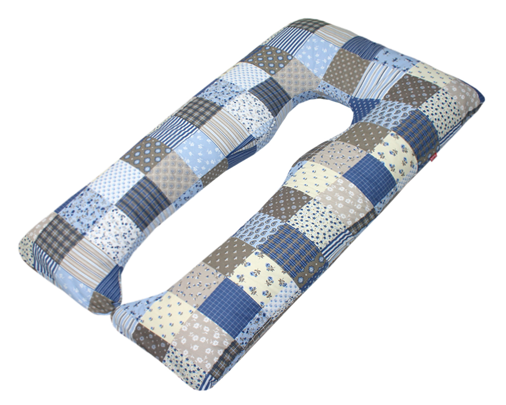 Prémium terhességi és ölelő párna, kék, patchwork mintájú huzattal.